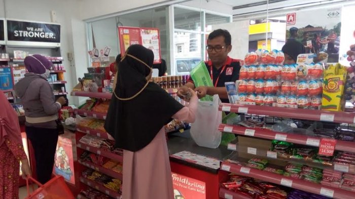 TRIBUN-TIMUR. COM, MAKASSAR - Kepala Cabang Alfamidi Branch Makassar, Didik turun langsung melayani customer di tokoAlfamidi Hertasning 4 Makassar, Selasa (4/9/2018).